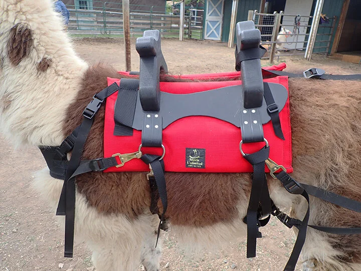Two QUICK RELEASE BUCKLES on the FRONT of the pad connect the diagonal strap on the chest strap. Within each cover is a 5/8”thick felt pad, surrounded by 1/4” closed-cell foam. The design allows for custom fit on extreme sizes and shapes of llamas.